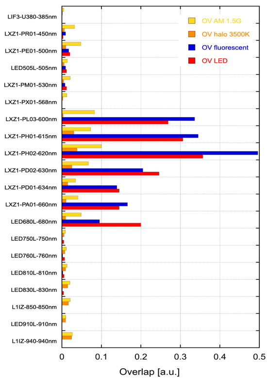 The overlap integrals were calculated, integrating the product of the SQEs and the spectra of the light sources over the wavelength range. For the sake of a proper comparison, the lamp spectra were normalized with respect to their integrals in order to make each spectrum represent a light source with the same total output power. The resulting overlap integrals are visible in Figure 7 with reference to four light sources. The figure shows that the most promising devices are LEDs with emission wavelengths between 600 and 660 nm. In addition, most LEDs in this interval exhibit particularly large overlap integrals, with the best performance expected under fluorescent or LED illumination. Finally, some blue-emitting LEDs operate better under sunlight similarly to some infrared LEDs. The higher conversions under LED and fluorescent illumination are quite encouraging as such sources can be easily found indoors. The very high quantum efficiencies expected with the latter confirm that LED-based energy harvesting systems are well suited for the most common indoor applications, a win–win condition.