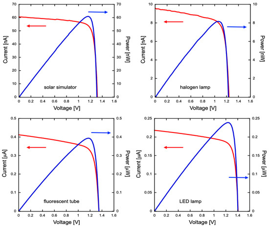 The overlap between LED–SQE and the spectral irradiance of the light sources considers only the device photocurrent whereas it does not account for the voltage contribution to the converted electrical power. Therefore, in order to evaluate the conversion efficiency, the current–voltage (I–V) and the power–voltage (P–V) characteristics were acquired under different illuminations. We tested the most promising devices, as pointed out by the overlap integrals in Figure 7. All I–V curves were measured after setting the sources at the same intensity of 100 µW/cm2, as quantified with a wide-spectral-range thermopile (Thorlabs S302C, Newton, NJ, USA). The I–V and P–V characteristics of LXZ1-PH02 (LED emitting at 620 nm) under various illumination types are presented in Figure 8.