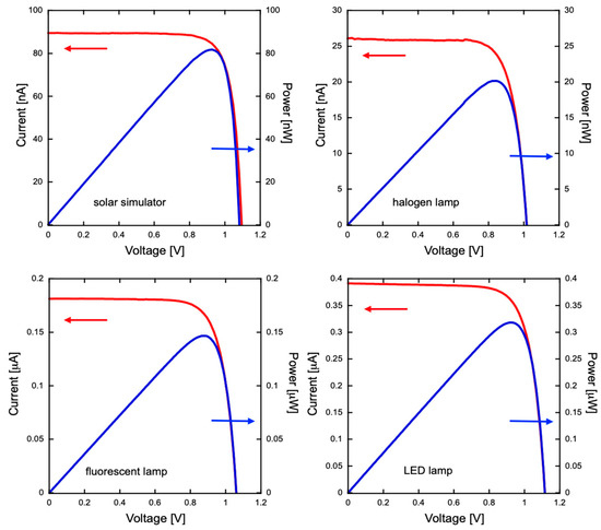 Current–voltage (red) and power–voltage (blue) characteristics of LED680L at 100 µWcm2. C–V and P–V characteristics were gathered as described in Figure 8.