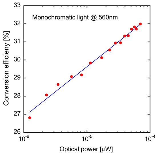 It is well known that photovoltaic devices exhibit a logarithmic increase in efficiency as the light intensity increases. Therefore, we studied some LEDs under varying light powers. Typical results are shown in Figure 11, graphing efficiency versus power for LXZ1-PH02. The logarithmic trend was confirmed, with efficiency changing at a rate of about 10%/decade, providing information on the actual efficiency to be expected at each illumination level.