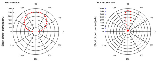 Polar patterns of the short-circuit current of the LED with a flat surface (left) and the LED packaged with a glass lens (right).