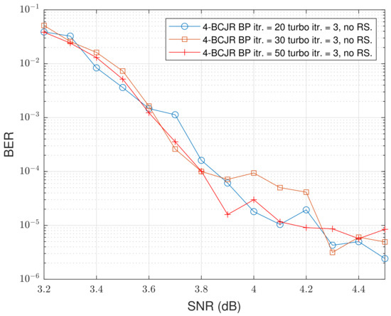 We simulated 5G LDPC code and turbo equalization in FTN signaling with MATLAB. The diagram is depicted in Figure 1. The LDPC code used here is a (7680, 3840) code based on BG2 [24]. We used shortened as in (5) and used BPSK modulation for the baseband system model. We used turbo equalization containing an M-BCJR detector and BP decoding for demodulation. Considering complexity and latency, we chose a maximum turbo equalization count of 3 to lower the number of whole iterations and states stored at each stage of the trellis in BCJR detection, i.e., 4-BCJR detection, to reduce memory usage. We considered maximum iteration limits of 10, 20, and 50 for BP decoding. Therefore, in total, three iterations of the 4-BCJR algorithm and 30, 60, and 150 iterations of BP decoding were performed at most for three turbo iterations. Unfortunately, an error floor was found near as in Figure 2. It can be eliminated through many detection and decoding iterations, but this is unacceptable considering the low latency and storage. Accordingly, few turbo iterations and states of FTN detection can be adopted. With sufficient SNR, the error floor of the BP decoder will disappear independently. It appears in the BER region () of most concern in wireless communication, which is why we must lower or eliminate the error floor.
