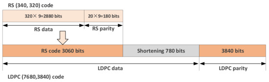 The structure of the proposed LDPC-RS concatenation code is depicted in Figure 3. We chose RS (340, 320) and a shortened version of RS (511, 491) code for BP decoding, and the corresponding generation polynomial coefficients are 1, 58, 257, 157, 222, 388, 151, 62, 280, 137, 404, 286, 394, 61, 399, 73, 84, 145, 293, 369, and 331. We adopted 5G LDPC (7680, 3840) code for the inner code, with 780 bits shortened (filled with a known pattern which is not transmitted) and accustomed to the 3060-bit length of outer RS (340, 320) code. Therefore, there are bits of data, the total transmitted code length is bits, and the code rate is . The price of 0.09 rate-loss is acceptable considering rate and error floor trade-off.
