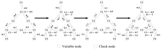 One example of BP decoding in a (6, 3) trapping set. Three variable nodes all have incorrect negative values, meanwhile relevant check nodes are weak and cannot provide error correction during BP iterations.