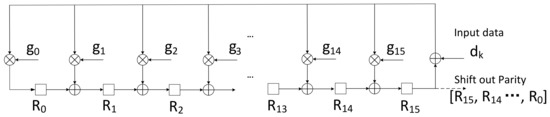 The conventional RS encoder adopts a serial structure that can be treated as a digital circuit. It consists of shifting registers and constant multipliers [26], depicted in Figure 7, whose control, initialization, and reset logic are not depicted here. There are 20 shifting registers and 20 constant multipliers for RS (340, 320) code together with 20 adders (bitwise XOR). After data are serially input, contents of registers are serially shifted out in the sequence of , which are parity bits, accordingly.