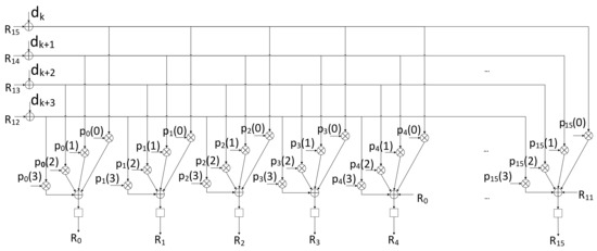 The solution is to form zero and the unit input, then leave the calculations to the serial encoder (through MATLAB in this study). We give the following detailed explanations. The 4-parallel encoder runs for 1 clock, which is equivalent to the serial encoder running for 4 clocks. In step 1, with other terms set to zero, and applying (24), we obtained . In step 2, we obtained . In step 3, we obtained . In step 4, we obtained . Since will not change with k, the calculation of parallel multiplication coefficients is complete. Thus, we propose a 4-parallel encoder whose structure is given in Figure 8. Furthermore, since the initial states of the registers are all zero, step 2 can be simplified as input , letting the serial encoder run for 3 clocks, and step 4 can be simplified as input , letting the serial encoder run for 1 clock (). We can accordingly propose Algorithm 2.