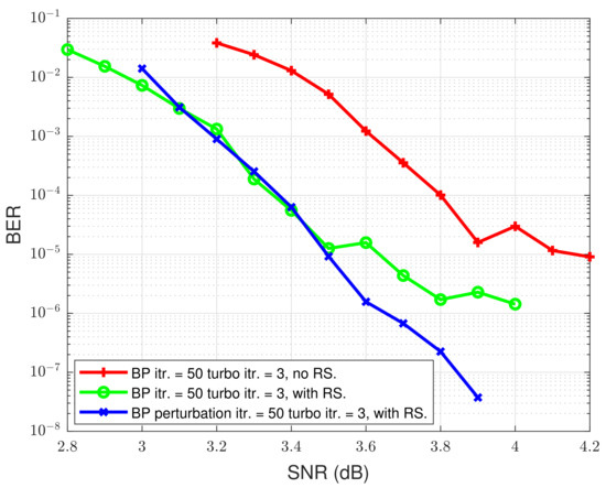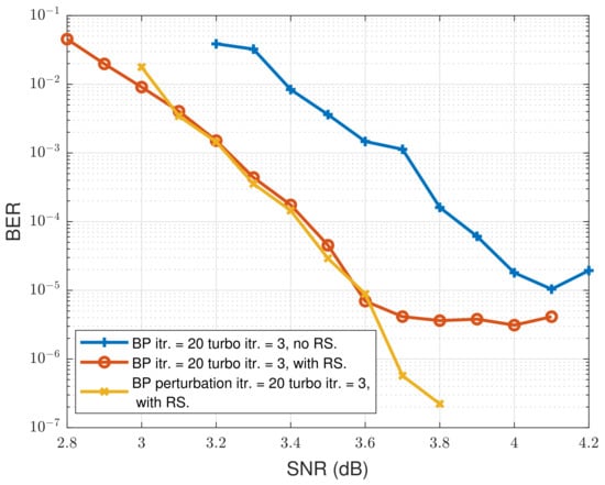 A typical bit error rate (BER) curve of channel coding resembles a waterfall, i.e., the BER drops sharply when the signal-to-noise ratio (SNR) increases. However, an error floor phenomenon can be found with many LDPC codes; when SNR increases, the BER does not decrease, or the curve flattens. According to [6], the error floor [7] is caused by sub-optimal iterative decoding [8], near-code words [9], and absorbing and trapping sets [10]. In some situations, the error floor can not be eliminated, and there are some methods to lower the error floor, for example, designing a large-girth parity matrix to optimize the code structure; using concatenation code, such as RS-LDPC [11] or DVB BCH-LDPC code [12] that utilizes RS or BCH as the outer code and the LDPC as the inner code; or manually introducing low-magnitude noise to message-passing decoders to lower the error floor. For some conditions, such noise can actually improve decoding performance [13]. This improvement, based on the effect of noise, is called stochastic resonance. We can refer to the introduction of such noise as perturbation. Perturbation decoders have exceptional performance and very low resource costs [14] and may prove superior to the existing techniques [15] in computer memory and data storage applications [16]. Details about stochastic resonance can be found in [17]. Note that the error floor may occur in a particular code and may not occur in another, and it is hard to predict whether it will occur. For example, the 5G LDPC (7680, 3840) code used in this study has no error floor in orthogonal (Nyquist) systems. However, when utilizing FTN signaling, we found an error floor in a rate-1/2 LDPC code masked from the 5G base graph “BG2”. This is probably caused by the decoder’s non-linearity, too few turbo iterations, improper loop gain or code rate, or a weakness in the masked base matrix structure. Since this phenomenon exists and is unpredictable, we require a method to lower the error floor that may occur in the demand region of the BER for practical situations. In this work, we utilized two of the above methods: LDPC-RS concatenated code and a perturbation BP decoder to lower the error floor.
