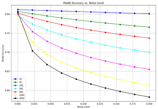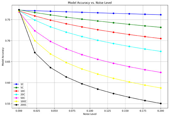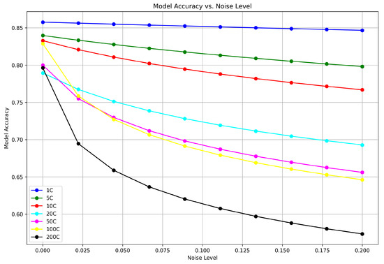 We present the privacy and model accuracy trade-offs in Figure 1, Figure 2 and Figure 3. Multiple lines in the Figure, each representing different client configurations from 1C (single client) to 200C (two hundred clients), show that as the noise level increases, the accuracy for each configuration decreases. The decline is more pronounced with a lower number of clients; the 1C configuration starts with the highest accuracy and shows a sharp decline in performance as noise increases. In contrast, the 200C configuration begins with lower accuracy, which decreases more gradually with added noise. These visual data suggest that models with fewer clients are more sensitive to the addition of noise, while those with more clients are somewhat more resilient but start at a lower accuracy level.