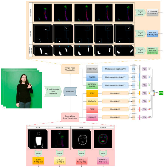 The SLR method proposed in this paper aims to classify isolated sign language words using features specifically based on finger data. A detailed analysis of the fingers was made possible with the pose data obtained using the MediaPipe library. We created FINGER data by visualizing each finger pose in a separate channel. Furthermore, MERGED-FINGER data, which provide a closer look at the spatial features of the fingers, were created by cropping and merging finger regions from the FINGER data. In addition, we developed FD-FINGER data to capture temporal information by applying the frame difference method to the FINGER data. In response to these features, we propose the MultiChannel-MobileNetV2 model, which processes each channel separately. The proposed method applies PCA to the features obtained from these models, followed by their combination and classification using SVM. The proposed method, based on finger data, is extended and made more robust by including features of full-body and face data obtained from MobileNetV2 models, each trained separately. The general diagram of the proposed method is shown in Figure 1.