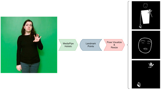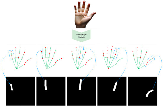 In our study, we used MediaPipe to obtain finger pose images. MediaPipe, an open-source library developed by Google, is based on deep learning and computer vision techniques [53]. Its “Holistic” module provides an integrated solution for monitoring movements of the face, hands, and body, offering comprehensive analysis capabilities [59]. The Holistic module detects body, face, and hand movements using a total of 543 key points: 33 for the body, 468 for the face, and 21 for one hand.