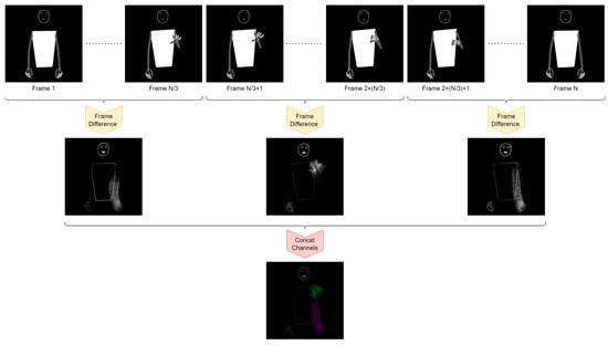 This method was applied for each channel in the FINGER data, and frame difference-FINGER (FD-FINGER) data of size 5 × 112 × 112 × 3 were obtained from a single FINGER data point. Similarly, the frame difference method was applied to the BODY and FACE data to generate 112 × 112 × 3-sized frame difference-BODY (FD-BODY) and frame difference-FACE (FD-FACE) datasets. These datasets, FD-FINGER, FD-BODY, and FD-FACE, encompass the extracted temporal dynamics from finger, body, and face movements, respectively, providing a comprehensive understanding of sign language gestures over time. A visualization of how FD-BODY data are derived from BODY data is presented in Figure 5. This illustration demonstrates that a video sample containing N frames is segmented into three equal parts. The frame difference method is then individually applied to each segment. Subsequently, the outcomes of these segments are amalgamated to create a composite RGB visual representation.