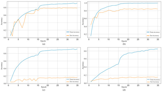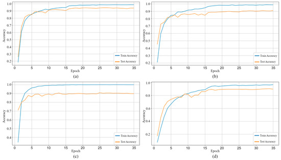 In the initial phase of this study, MultiChannel-MobileNetV2 models were trained using the obtained FINGER, MERGED-FINGER, and FD-FINGER data. Additionally, a conventional MobileNetV2 model was trained using HANDS data to evaluate the advantages of visualizing finger data in separate channels. The training and testing accuracy graphs of these models are presented in Figure 8. The performance metrics of the models’ test analyses are listed in Table 3.