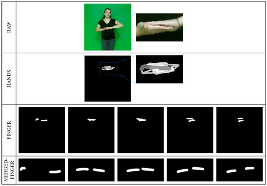 Following the creation of the frames containing the finger pose images, the regions containing the images of the fingers were then cropped and merged. These MERGED-FINGER images provided a closer and more detailed analysis of the FINGER, facilitating a clearer resolution of finger movements with complex and subtle details in sign language. A visualization of the generation of FINGER and MERGED-FINGER images from a sign language video frame is shown in Figure 3.