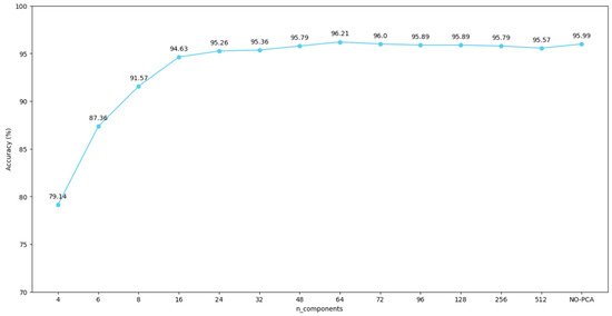In solving this equation, is an eigenvector and is the eigenvalue corresponding to this eigenvector. Eigenvectors with large eigenvalues represent the highest variance in the dataset and are selected as principal components. These two steps form the basis of PCA and provide the ability to retain important information while effectively reducing the size of the dataset. The ranking and selection of the eigenvectors allow the identification of the components that best represent the unique structure of the dataset. In our experimental studies, we compared the accuracy rates obtained by applying PCA with different numbers of principal components. Thus, the optimal number of principal components to maximize the model performance was determined.