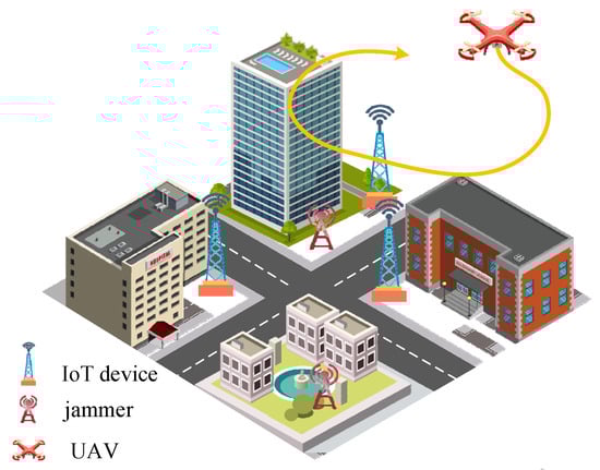 In recent years, the use of unmanned aerial vehicles (UAVs) as airborne base stations to assist in offloading hotspots in existing ground communication infrastructures and cellular networks has been recognized as a promising candidate technology. UAV-assisted communication, when combined with technologies such as the fifth-generation (5G) networks [1,2,3] and airborne self-organizing networks [4,5,6], has the potential to provide Internet of Things (IoT) services from high altitudes, creating an airborne domain for the IoT. In certain geographic regions where operators may not be able to afford to build a cellular infrastructure (e.g., a base station), as an alternative, UAVs can lower the communication costs while performing tasks such as collecting or transmitting data to ground-based IoT devices [7,8]. For instance, UAV-assisted cellular communication technology can efficiently restore wireless services after unexpected damage to facilities, such as from natural disasters (e.g., earthquakes, volcanic eruptions, and floods) or in hotspot areas (e.g., sports stadiums and outdoor events), where ground-based cellular stations are insufficient [9,10]. Compared to traditional satellite relays, UAVs fly at lower altitudes when acting as wireless communication providers, resulting in a higher optical resolution than that of traditional satellites. UAVs have lower maintenance costs and are typically tens or even hundreds of times less expensive than satellites [11]. Furthermore, UAVs are more flexible than traditional satellites, which can only fly according to preset orbits. UAVs can be deployed in a specific area according to demand to fulfill wireless communication tasks [12].
