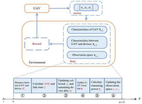 In reinforcement learning problems, the MDP is regarded as an idealized form that provides a theoretical framework for achieving goals through interactive learning. In the UAV-assisted communication model, we can use the MDP to simulate the interaction between entities. The complete MDP can be represented by a quaternion [29]. The MDP for trajectory optimization in the data collection scenario is shown in Figure 2, which details the interaction process between the UAV and the environment. Additionally, it provides a detailed description of the process of generating an arbitrary time-slotted state space, where process ⑤ is interchangeable with process ⑥.