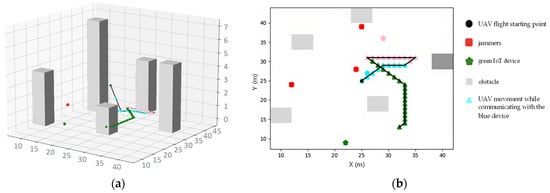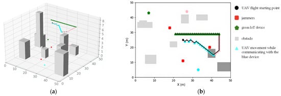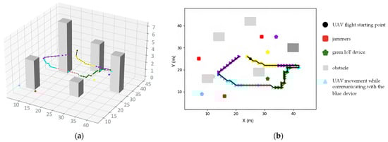 Example of UAV data collection under the 3G+8O scenario. (a) 3D UAV trajectory; (b) Top view of the scenario.