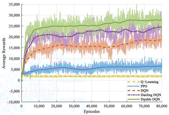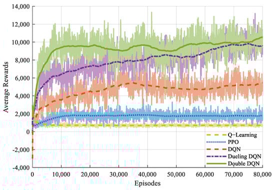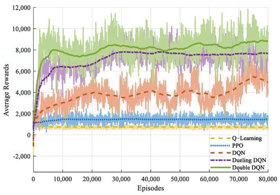 The simulation results indicate that Q-learning has the worst performance, with an average reward value that is only 10% of that of DDQN. This is because Q-learning requires the storage of the value function of each state–action pair, which can be very difficult, or even infeasible, in a high-dimensional state space. The PPO algorithm is only better than Q-learning because it does not use empirical replay when updating the policy network, resulting in the low utilization of empirical samples. Additionally, the algorithm’s performance is sensitive to hyperparameters. On average, DQN achieves only 50% of that of DDQN, due to overestimation, which leads to training instability and performance degradation. It is important to note that this is an objective evaluation and not a subjective one. Despite potential drawbacks such as implementation complexity and longer training times, dueling DQN may still be a better choice in certain problems and scenarios.