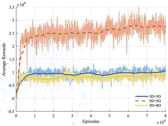 Figure 10 presents a comparison of the average rewards across the different scenarios under the DDQN algorithm. We obtain the following conclusions: (1) with throughput designated as the reward metric, scenario 5D+5O, characterized by an increased number of ground devices, achieves the maximum reward value compared to 3D+5O; and (2) likewise, in scenario 3D+8O, the higher obstacle density relative to 3D+5O imposes more penalties on the UAVs, resulting in a lower average reward value.