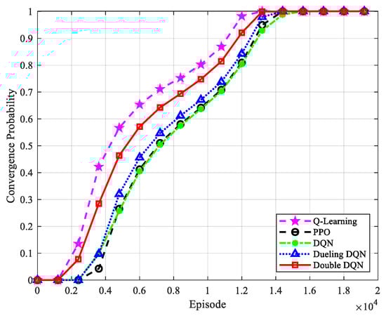 We also compared the convergence rates of the algorithms. The 90% confidence interval of the average reward value of each algorithm is used as the convergence interval to calculate the convergence rate of each algorithm in each scenario, and then the convergence rates of the algorithms in the three scenarios are used to obtain that shown in Figure 11. The experimental results indicate that, while ensuring the optimal value of the average reward, both the DDQN and the dueling DQN exhibit a better convergence rate compared to the PPO and DQN algorithms. However, the Q-learning algorithm has the fastest convergence rate but the lowest average reward value, resulting in a poor convergence performance.