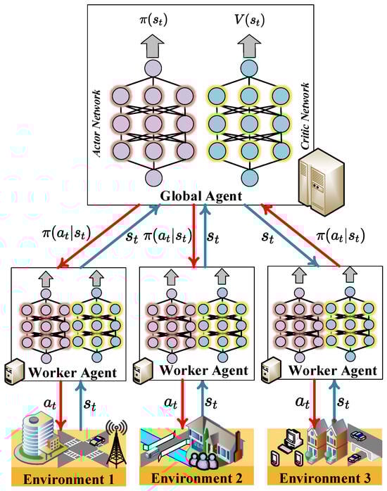 To achieve the optimization goals mentioned above, and to adapt to complex and dynamic microservice placement environments and constraints, as well as to reduce human intervention in placement, this study proposes an algorithm based on asynchronous reinforcement learning (RL) for secure microservice placement. This study uses Actor–Critic as the basic framework, but unlike the traditional Actor–Critic model, the asynchronous security algorithm proposed in this paper improves convergence by introducing multiple parallel intelligences. Each agent possesses its own parameters and policies, allowing them to interact and learn in diverse network environments. After a certain number of learning iterations, the gradient of the loss function in each agent is calculated and updated in the central neural network. The whole architecture is similar to a tree of public ancestors. Because each intelligence learns individually in its own environment, the empirical data collected are relatively independent and do not affect each other, thus increasing the diversity and richness of the samples. After updating to the established rounds, the model of the central network is the final model this study uses for making the selection of nodes for microservice placement.