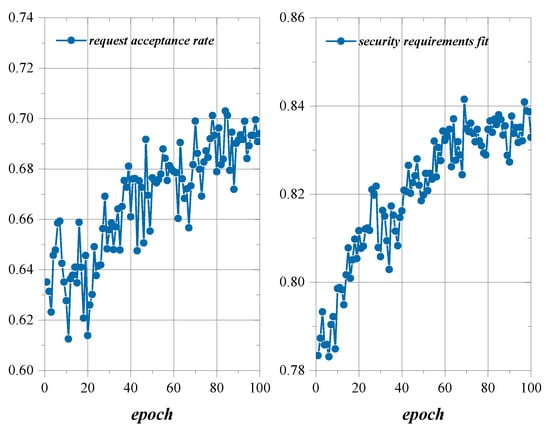 This study documents in Figure 3 the changes in the request acceptance rate and the fit of the security requirements of the algorithm during the training process. In the pre-training phase, the algorithm is in an exploratory phase and underperforms on the two evaluation indicators because it has not learned a good microservice placement strategy. As the training proceeds, the algorithm improves its performance on the evaluation indicators based on the feedback of the reward changes. As the training proceeds, the changes in the evaluation indicators gradually slow down, and the algorithm gradually reaches a converged state. Thus, Figure 3 demonstrates that the performance of the algorithm proposed in this paper can be significantly improved with more training iterations and also demonstrates the convergence of the algorithm.