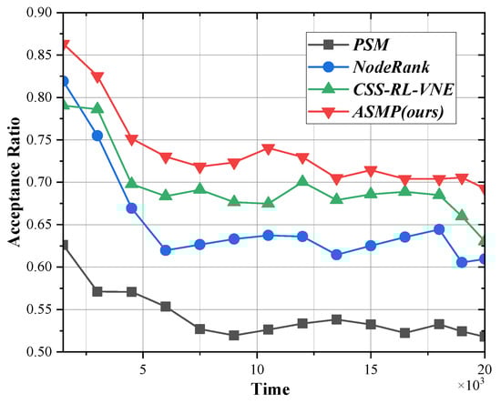 - CSS-RL-VNE [45]: CSS-RL-VNE uses traditional RL methods as a means to improve the algorithm’s performance. The important attribute features of the underlying network are extracted for training by involving the policy network; the deployment possibilities are ranked based on the training results, and the physical node with the highest probability of successful deployment is selected as the deployment node.