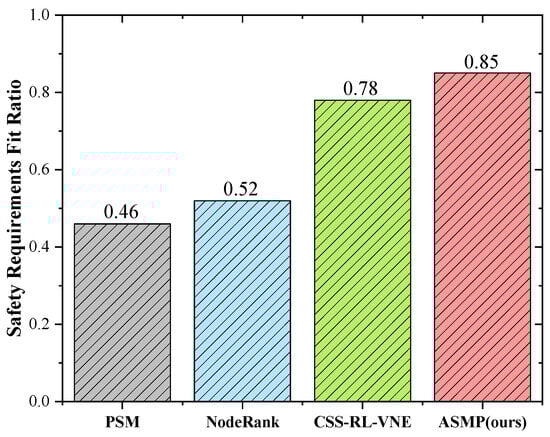 As can be seen in the right-hand side of Figure 5, the proposed algorithm also performs better than the other three algorithms in terms of the fit to the user’s security needs, thanks to the security considerations this study has included in the algorithm. Among the comparison algorithms, PSM and NodeRank show very low levels of fit because they do not take security into account. The reason why the CSS-RL-VNE algorithm performs better than PSM and NodeRank is because it takes security into account. However, compared to the ASMP algorithm proposed in this paper, it does not consider the fit to the user’s security requirements, which leads to excess performance even if the minimum security requirement is met. For example, if a microservice only needs to be deployed into a node with security level 3 to satisfy its minimum security requirement, the CSS-RL-VNE algorithm may place it into a physical node with security level 8 to satisfy its security requirement. In this process, there is an excess of resources. Unlike the CSS-RL-VNE algorithm, the proposed algorithm is designed with fit to user security requirement in mind. The algorithm proposed in this paper achieves a security requirement fit of 0.85 in the Gemmery50 network topology. This means that on the basis of satisfying the basic security requirements of the microservices, the chosen security level does not exceed the microservices’ needs too much and thus reduces the redundancy of security resources. As shown in the experimental results, there are two main reasons why the algorithm does not fully achieve a 100% fit to user security requirements. First, since the primary goal is to ensure the normal deployment and operation of the application, the algorithm will first meet the basic security requirements and resource requirements to ensure placement with the greatest success rate and then will consider the degree of fit to security requirements, which inevitably will in the microservices being deployed in a node that exceeds the security requirements. Secondly, the distribution of security levels in the Gemmery50 nodes is not regular, and it is difficult to make the sum of the number of nodes in each security level exactly equal to the security requirements of the applications. Moreover, normal development may involve business expansion and security level upgrading, so leaving an appropriate security margin can reduce the costs of future maintenance.