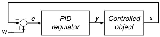 The PID regulator is expected to tune the process variable x, which is not directly accessible, as close as possible to the setpoint w. This is accomplished through the appropriate adjustment of the manipulated variable y. The regulator evaluates the required value of the manipulated variable based on the error signal e = w − x, which is formed in the summing node.