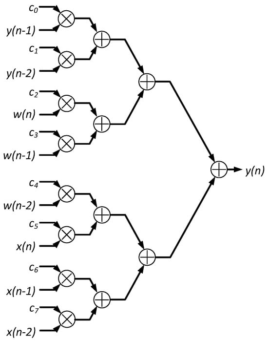 Another possible application of the circuit presented in Figure 3 consists of using it as a regulator, which is dedicated to a specific object (e.g., a DC–DC converter). In such a case, it is quite possible that the regulator parameters will not change during the whole lifecycle of the device. Thus, the set of regulator parameters can be calculated only once, before the circuit is actually synthesized, and the new values for the coefficients can be implemented as constants. In such a case, the CPU/MCU core is not required, and the components of the circuit presented in Figure 3, responsible for controlling the coefficient update, i.e., the input, together with the corresponding And functor, can be deleted.