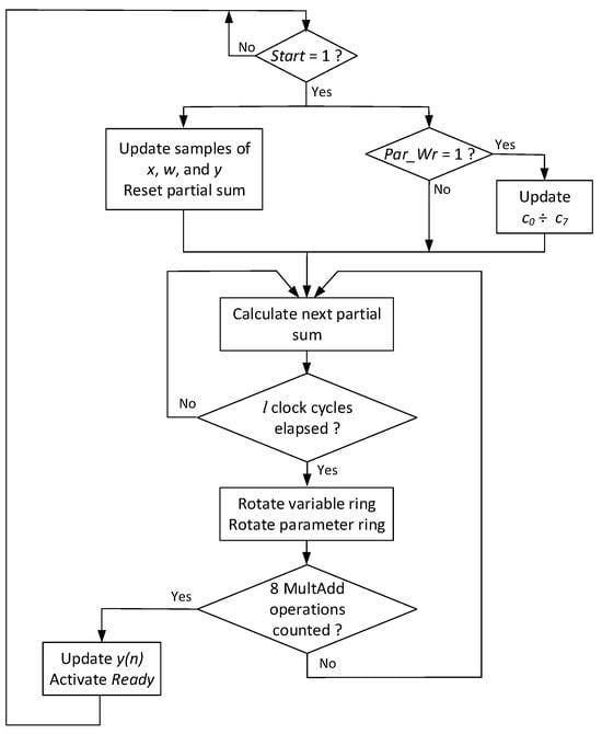 A simplified block diagram, depicting the operation of the circuit, is presented in Figure 4. The calculations described by Equation (18) are performed sequentially, i.e., initially, the product is calculated; then, the content of the rings is shifted right; then, the product is calculated and added to , which is available at the MultAdd block output q after the first product is calculated. Upon the completion of these calculations, the data are shifted once again, and the product is calculated and added to the result of previous operations. Subsequently, the , , , , and products are calculated and added to the temporary sum. Upon the completion of eight shift-and-calculate operations, the new sample of the manipulated variable y(n) is available at the MultAdd block output. The value is stored in a parallel register to be available for reading using external circuitry, and the circuit is ready for calculating the next sample of y.