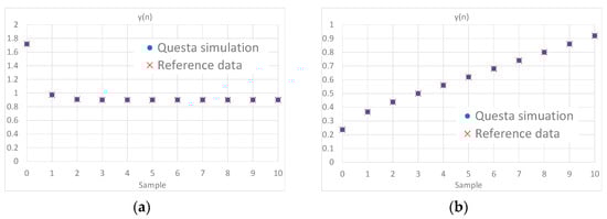 A simple Verilog testbench was prepared to supply appropriate samples of the x(n) and w(n) signals to the circuit inputs and to collect samples of the output signal y(n). The open-loop configuration was tested, i.e., the regulator as a standalone block without the manipulated object, and not surrounded by the negative feedback loop (see Figure 1).