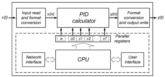 The coefficients are complex functions of KP, TI, TD, a, b, c, and TS, containing, in particular, the division operation (see Equations (19)–(26)). Implementing the conversion functions in hardware would be very expensive in terms of logic resource usage. On the other hand, a change in the PID regulator parameters is quite a rare case, if compared to cyclic and permanent calculations of new samples at the regulator output. Calculating new values of the coefficients is not a time-critical task, and it can be conveniently handled using software running on the CPU. Moreover, introducing a CPU core to the device structure facilitates the implementation of many additional useful functionalities, like handling user interface, network communication, self-diagnostic, or, in particular, autotuning algorithms.