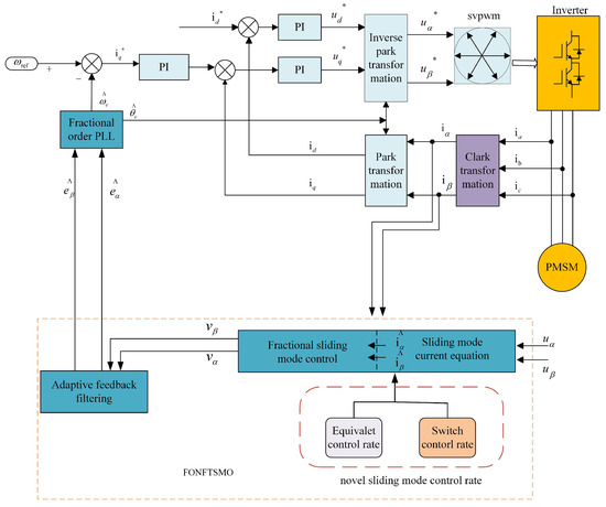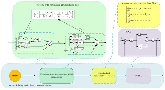 Based on the above factors, the improved partial structure diagram is shown in Figure 4 below. In this paper, a novel FONTSMO observer motor control system is designed by combining the novel approach rate, fractional terminal singular sliding mode, adaptive back electromotive force filter, and fractional phase locked loop.