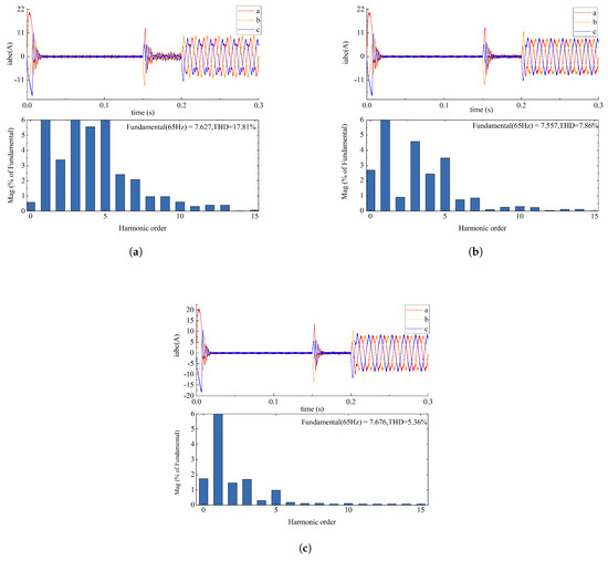 Figure 6a–c show the three-phase current waveform and the Fourier analysis of the traditional sliding mode observer, second-order sliding mode observer, and the fractional non-singular terminal sliding mode observer under preset simulation conditions, respectively. It can be seen from Figure 6a that the total harmonic distortion of the three-phase current of the traditional sliding mode observer reaches 17.81%, in which the content of the fifth, seventh, and ninth harmonics is large, indicating that the traditional sliding mode observer is not ideal in suppressing the harmonic of the three-phase current, and it is difficult to achieve a good harmonic suppression effect. It can be acquired from Figure 6b that the total harmonic distortion rate of FONTSMO’s three-phase current is 7.86%. It can be acquired from Figure 6c that the total harmonic distortion rate of FONTSMO’s three-phase current is 5.36%, and the suppression effect of the fifth, seventh, and ninth harmonics is more obvious, and the suppression effect of the three-phase current is better.