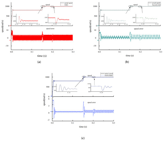 Figure 7c, respectively, show the speed diagram and speed estimation error diagram under the control of FONTSMO algorithm. Compared with the traditional sliding mode observer algorithm, the speed estimation error of the FONTSMO algorithm is 1.76 rad/s, the speed waveform is smoother, the speed estimation error is small, and the dynamic characteristics of the system can be effectively improved.