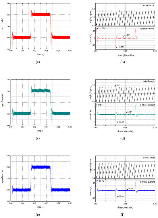 In order to further study the two control strategies under the control of the motor under load, the dynamic characteristics of time were used. Accelerate the motor to 1000 rad/s, apply a load of 8 to the motor when it runs to 0.1 s, and remove the load at 0.2 s. Furthermore, record the motor operating conditions within 0.3 s. Figure 11a–f are the speed diagram of the traditional sliding mode under sudden load, the rotor position estimation diagram, and the A-phase current diagram of the motor.