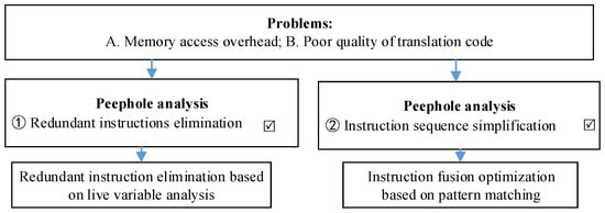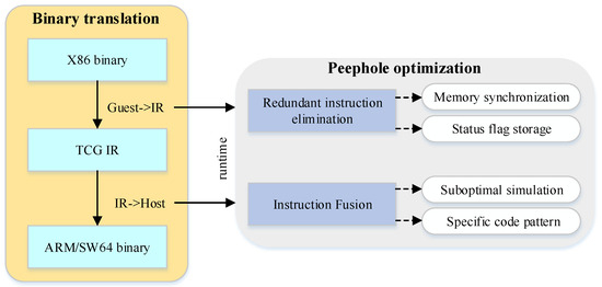 This paper overcomes challenges in cross-ISA DBT by incorporating peephole optimization to emit better-quality host codes. Specifically, we analyze four scenarios related to redundant memory access in the intermediate code generated by QEMU. We employ data flow analysis to optimize variable redundancy in write-back operations and flag redundancy in storage operations, particularly in scenarios like store–store and store–load (Section 4.2). Additionally, we propose pattern-matching between guest and host ISAs to facilitate instruction fusion optimization, thereby enhancing the quality of generated instructions (Section 4.3). The structural framework of this paper is outlined in Figure 1.