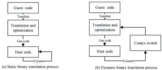 Code translation and execution flow of different translation methods. (a) Description of the code translation and execution flow of static binary translation. (b) Description of the code translation and execution flow of dynamic binary translation.