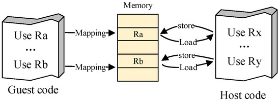 Program state virtualization dynamically maintains guest resource state in alignment with the instruction execution flow. One challenge in program state virtualization is dealing with register sets between different architectures. In practice, guest registers are mapped to virtual registers within the context of DBT, and these virtual registers are then mapped to specific host memory addresses. The mappings involve numerous intermediate variables. Memory-access overhead, however, is significant.