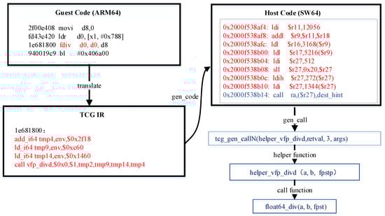 To ease the development, debugging, and maintenance of DBT systems, DBT relies on helper functions to translate guest instructions with complex semantics and functionalities, for example, SIMD, FP, and CPUID instructions. That is, exhibits a specific function. For example, as illustrated in Figure 4, the translation from ARM64 fdiv (marked red in Figure 4) to the SW64 platform (an efficient RISC architecture) can be managed through a float64_div helper function (marked blue in Figure 4).