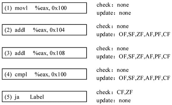The update and check for each status flag in the provided assembler code are drawn as Figure 6. The ‘movl’ instruction in (1) does not modify any status flags. Sequentially, both ‘addl’ instructions in (2) and (3) update the OF, SF, ZF, AF, PF, and CF. Similarly, the ‘cmpl’ instruction in (4) updates these flags. The ‘ja’ instruction in (5) checks the CF and ZF flags affected by (4), determining the program’s next state. Notably, the status flags modified by (2) and (3) are overwritten by (4), and a store-after-store memory occurs. Ideally, only the required status flags updated by (4) are needed.