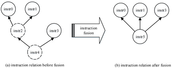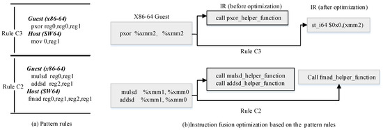 Instruction fusion has been commonly applied in processor co-design, aiming to enhance instruction field utilization and code density [30,31]. Celio et al. [32] employed macro-op fusion to accelerate idioms created by legacy ISA decisions, altering the ISA shape to match internal macro-ops and facilitating the addition of new ISAs. Singh et al. [33] focused on instruction fusion, exploring opportunities for fusing additional instructions in a high-performance general purpose pipeline. Lupon et al. [34] used DBT with slight modifications to an FMA unit, and achieved the fusion of FP multiply and FP add to produce an FP multiply–add instruction. However, these co-design methods primarily require synchronous modifications. In an attempt to improve the quality of host-side code, Jiang et al. [35] proposed a parameterized translation rule learning method for instruction generation. While this method demonstrates high translation efficiency, its flexibility is relatively constrained. In contrast, this paper uses the existing framework of binary translation, which creates its own patterns during instruction translation and subsequently maps these patterns to generate efficient instructions that adhere to the target architecture.