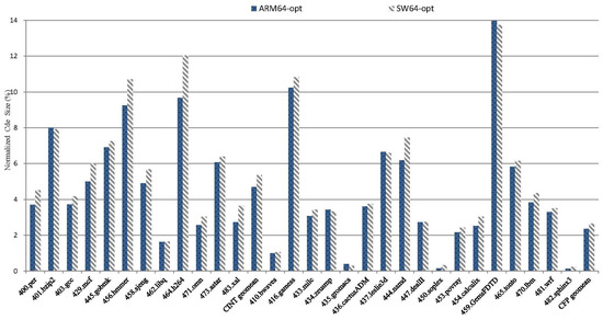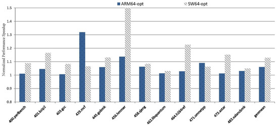 An interesting observation arises when comparing the impact on specific benchmarks. For example, the 456.hmmer benchmark for SW64 experiences a significant acceleration effect, while the 403.gcc benchmark does not. Further analysis of the hotspot blocks in the 456.hmmer reveals that a substantial portion (59.2%) of instructions involve operations between memory and general access, such as ‘mov’ and ‘adds’. As a result, this benchmark entails a large number of memory-access instructions. In contrast, the hotspot block in the 403.gcc benchmark involves relatively fewer memory access events.