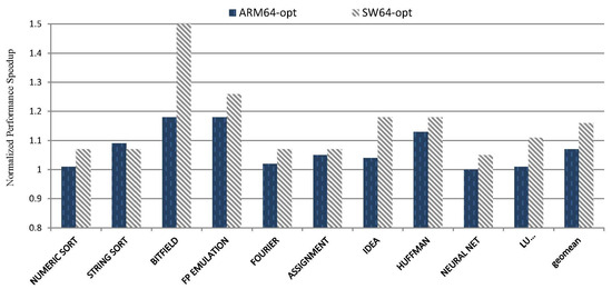 Figure 16 shows the normalized speedup achieved by our optimization on Nbench suite. In SW64 architecture, BITFIELD exhibits a maximum speedup of 1.64×, with an average speedup of 1.16×. On the other hand, for ARM64 architecture, BITFIELD showcases a speedup of 1.19×, with an average speedup of 1.08×. Interestingly, BITFIELD is sensitive to our optimization, this is because the hotspot of BITFIELD primarily involves extracting memory data, performing calculations, and then writing the result back to the original location. In QEMU, both arithmetic and logic operations require significant status flag storage. Our optimization proposed in this paper effectively amortizes the memory storage overhead.