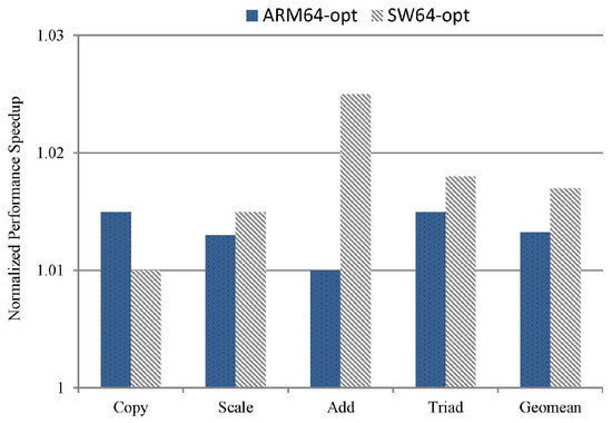 We evaluate our proposed techniques using Stream with multiple threads. Specifically, we configured the number of threads to 32 and executed the binary code generated from DBT. The acceleration effect is summarized in Figure 19, showing a speedup ranging between 1.0× and 1.02×. This indicates that our optimization is applicable to multi-threaded applications.