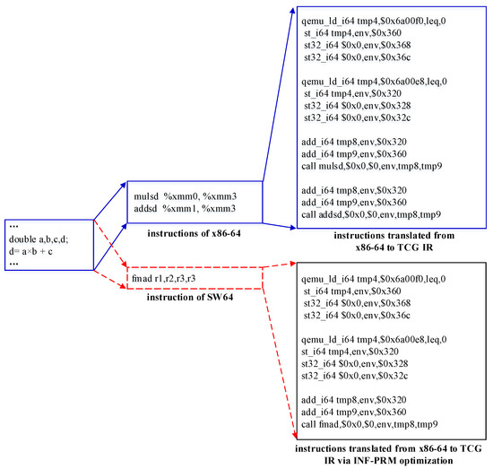 By default, x86’s gcc compiler (O2) does not generate a scalar floating-point multiply–add instruction for this expression. It resorts to ‘mulsd’ and ‘addsd’ instructions. In contrast, SW64 and ARM64 support more optimized ‘fmad’ (multiply–add) instruction, combining ‘mulsd’ and ‘addsd’ into a single instruction. During x86-to-SW64 and x86-to-ARM64 translation, the original guest semantics are maintained, simulating ‘mulsd’ and ‘addsd’ separately. This results in extensive computational and memory-access operations, as depicted in Figure 7. As a result, the instruction simulation by DBT is less competitive than that of native compilers.