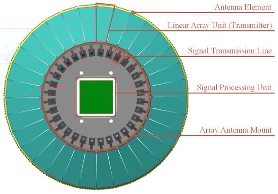 Our approach utilizes a polygonal array as an approximation of the circular array. As shown in Figure 1, this study designs a conventional linear array in a head-to-tail configuration to approximate a circular array. It is accurate within the framework of this research to describe this circular formation as effectively an inner regular polygon, which serves as an approximation of an ideal circle. Each side of the polygonal array is identified as a linear array unit with the aggregate number of these units represented by . For enhanced clarity in analyzing the CFDA structure, the model from Figure 1 is simplified in Figure 2. We designate the due-north direction as the baseline, assigning the array element in this direction the index 0. The numbering of subsequent elements proceeds in a clockwise direction, concluding with . In an ideal circular array where each array element’s distance from the center is R (denoting the radius of the array), the distance from each element to the center in the polygonal array configuration is designated as . It should be noted that in the following description, the polygonal arrays are uniformly referred to as circular arrays.