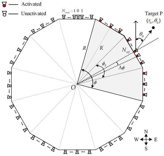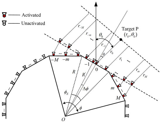 The theoretical analytical model of the circular array is depicted in Figure 2. Assuming the monitored target’s azimuth is precisely located at , represents the angle between the target direction and the north reference azimuth, and denotes the angle of activated arrays. Here, “target direction” is defined as the line from the center of the sub-array to the target. signifies the angle occupied by each array unit within the circular array, and represents the angular separation between two adjacent array elements, which is an approximation. To achieve a focusable beampattern on the monitored target, a suitable array element must be selected for activation. Initially, the determination of the reference array element index, represented by , is based on the target’s angle information and is calculated as follows: