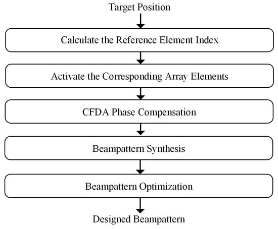 It is assumed that the target position is known to be . To generate a dot-shaped beampattern with lower sidelobes at the designated target location, this paper proposes a synthesis and optimization method for the beampattern based on the CFDA engineering model, as illustrated in Figure 5. Initially, the reference array element index is determined based on the angle information of the target. Subsequently, array elements within the aperture angle are activated. Next, phase compensation is applied to establish an isophase plane. Finally, beampattern synthesis and optimization are completed.